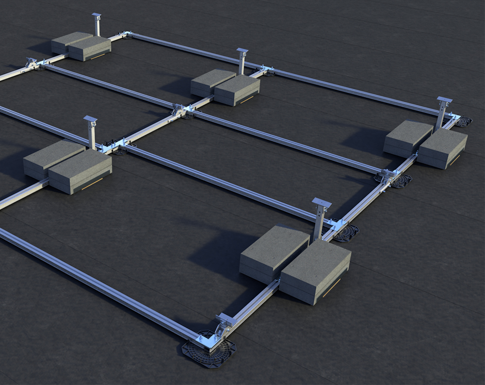 Um die Konstruktion sicher auf dem Dach halten zu können, werden die Balastwannen montiert und mit Steinen bestückt.