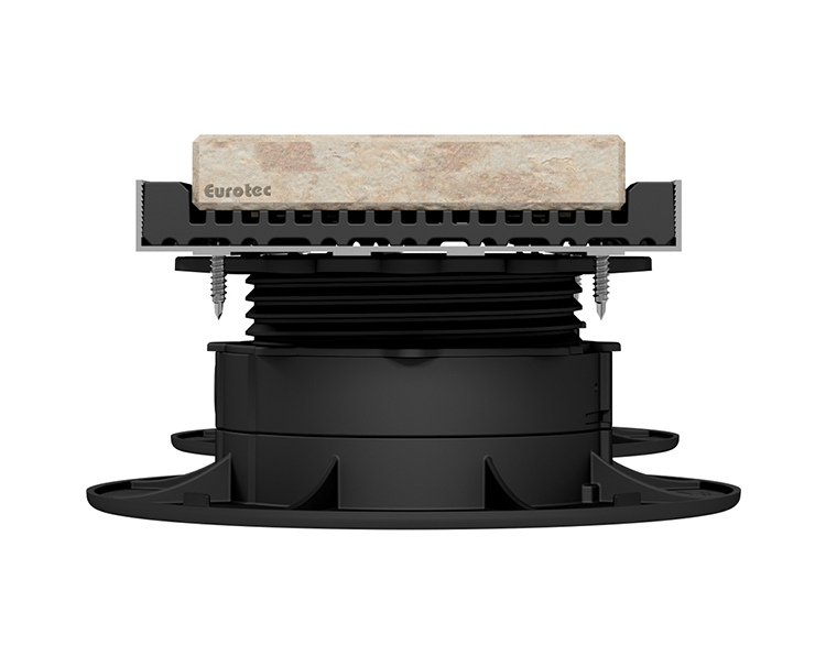 - Bei Anbringung der DrainTec Base auf einem unserer Verstellfüße PRO S-XL kann die eingelegte Steinplatte auf das Niveau der Steinplatten von der Terrasse gebracht werden.