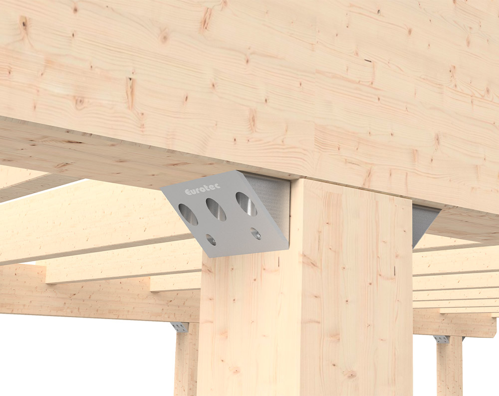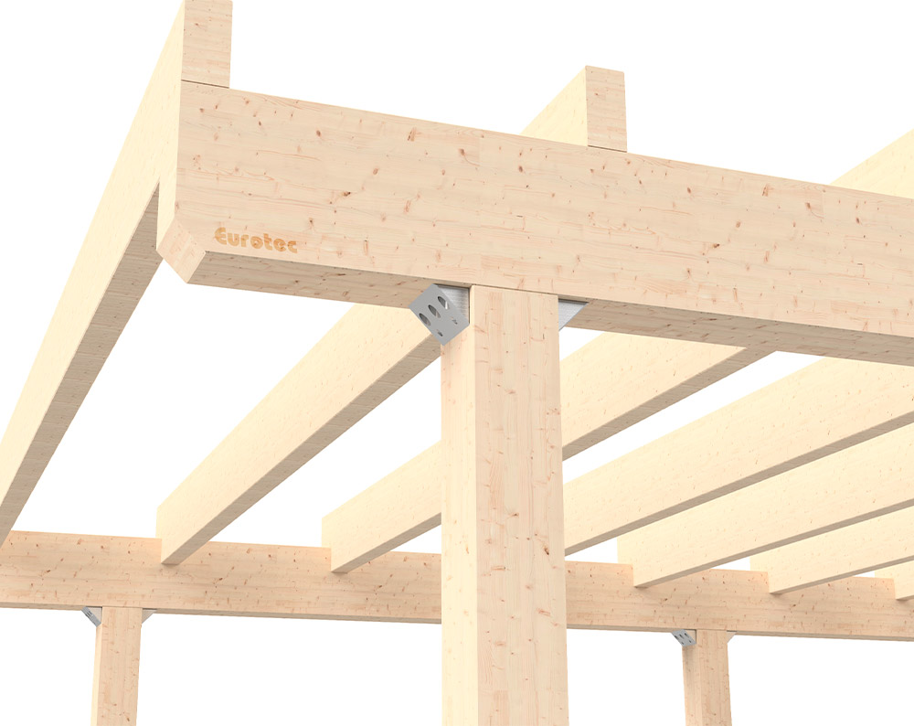Der EckTec-Verbinder wird mit zwei 4 x 40 Paneltwistec fixiert. Im Anschluss werden die ersten KonstruX ST Vollgewindeschrauben 8 x 155 unter 25° in den Pfosten gesetzt. Nach der Montage des Querbalkens, können die anderen KonstruX ST Vollgewindeschrauben 8 x 95 unter 90° gesetzt werden.