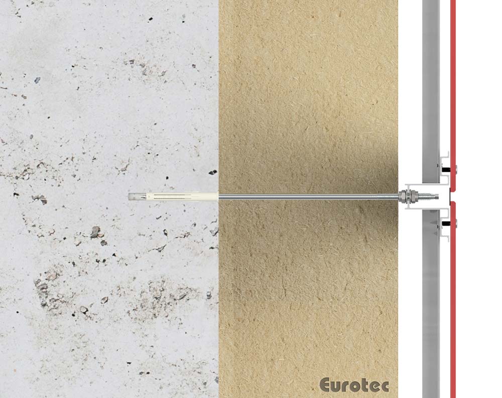 - Durch die frei drehende Gewindehülse am Kopf der Schraube kann die Unterkonstruktion der Fassade parallel zur Hauswand gerichtet werden