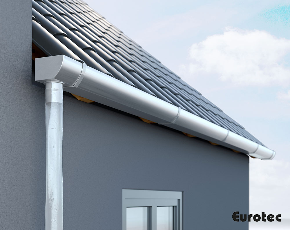 Zum Ableiten von Regenwasser ist der Eurotec Fallrohrschlauch der ideale Fallrohrersatz. Die Fassade wird vor Verschmutzungen geschützt. Außerdem ist der Fallrohrschlauch eine optimale und kostengünstige Übergangslösung bis zur finalen Montage der Fallrohre.