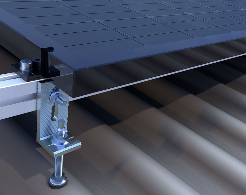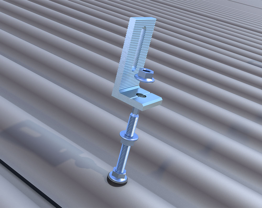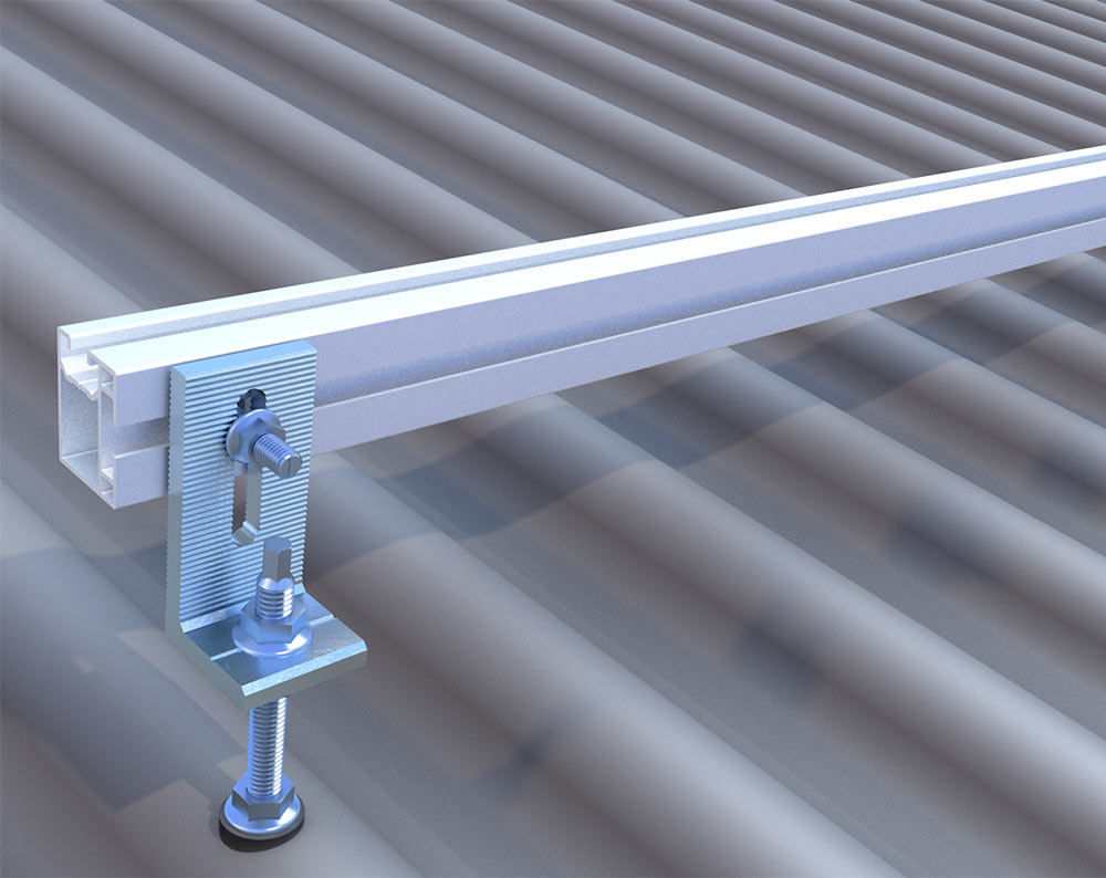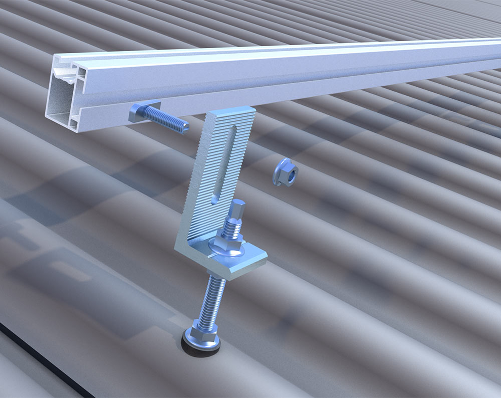 Der L-Adapter kommt zum Einsatz, um Montageprofile auf Wellblech zu montieren und so eine Konstruktion für Solarmodule herzustellen. Hierfür wird die Solarstockschraube auf dem Wellblechdach befestigt und anschließend mithilfe des L-Adapters mit dem Montageprofil verschraubt.