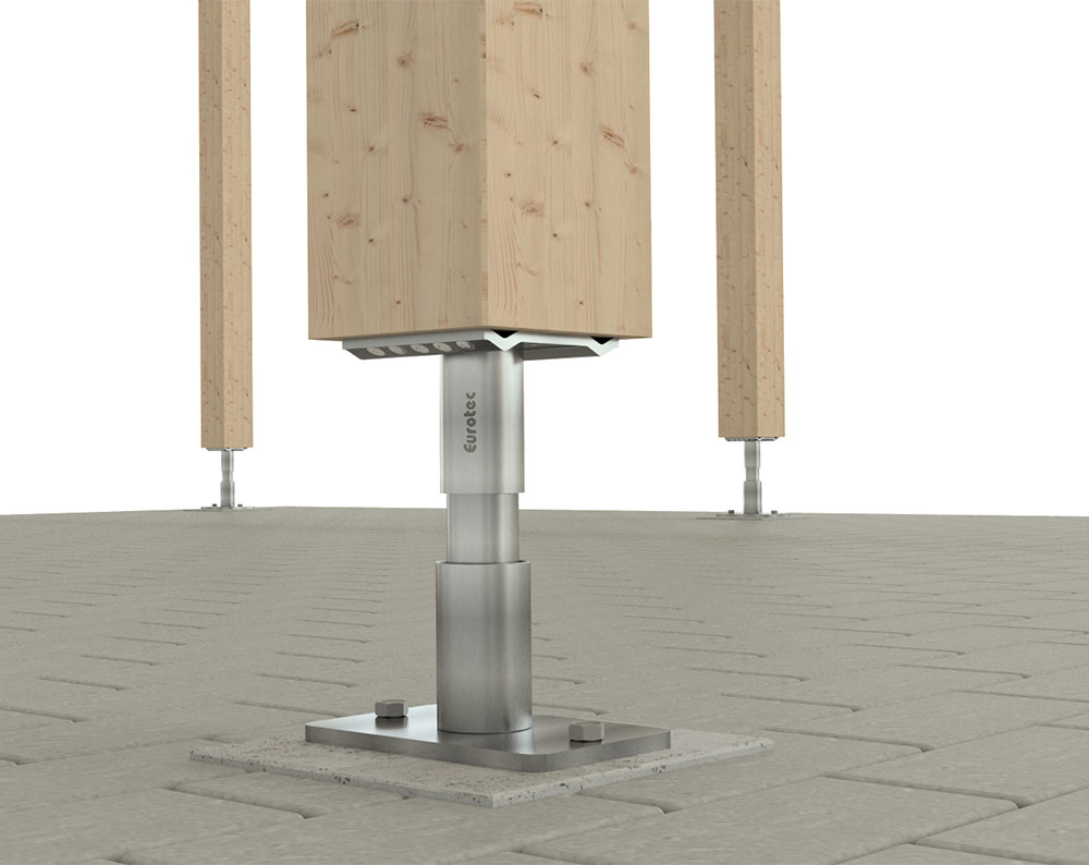 Für leichte Holzkonstruktionen kommen die Pfostenträger PediX Duo 150+45 und PediX Duo 190+80 zum Einsatz. Diese erfüllen die Anforderungen an den konstruktiven Holzschutz. Eine Zink-Nickel-Beschichtung gewährleistet die Dauerhaftigkeit der Stützenfüße. Für die Montage auf das Hirnholz sind keine Abbundarbeiten oder ein Vorbohren nötig. Ein Bajonettverschluss ermöglicht eine simple Montage des oberen Teils mit der montierten Stütze und dem verankerten Unterteil. Die Verbindung wird verriegelt, wenn der Verschluss eingesteckt und hochgezogen wird und kann dann zusätzlich Zugkräfte von der Stütze in das Fundament übergeben. Eine Höhenverstellbarkeit von 45 mm bzw. 80 mm ist nach der Montage weiterhin möglich.