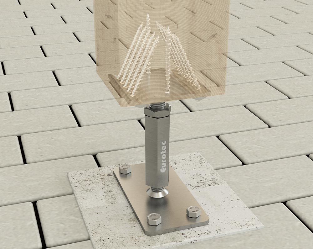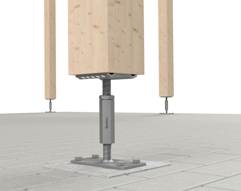 Pfostenträger erfüllen die Anforderungen an den konstruktiven Holzschutz - so auch unsere Pfostenträger PediX Easy 135+65 und PediX Easy 200+100. Die Montage auf das Hirnholz erfolgt ohne weitere Abbundarbeiten und Vorbohren mit Vollgewindeschrauben. Eine Höhenverstellbarkeit der Sützenfüße von 65 mm bzw. 100 mm ist nach der Montage weiterhin möglich. Weiterhin können zusätzliche Horizontallasten mithilfe der Stützenfüße aufgenommen werden. Eine Zink-Nickel-Beschichtung gewährleistet die Dauerhaftigkeit des Fußes.