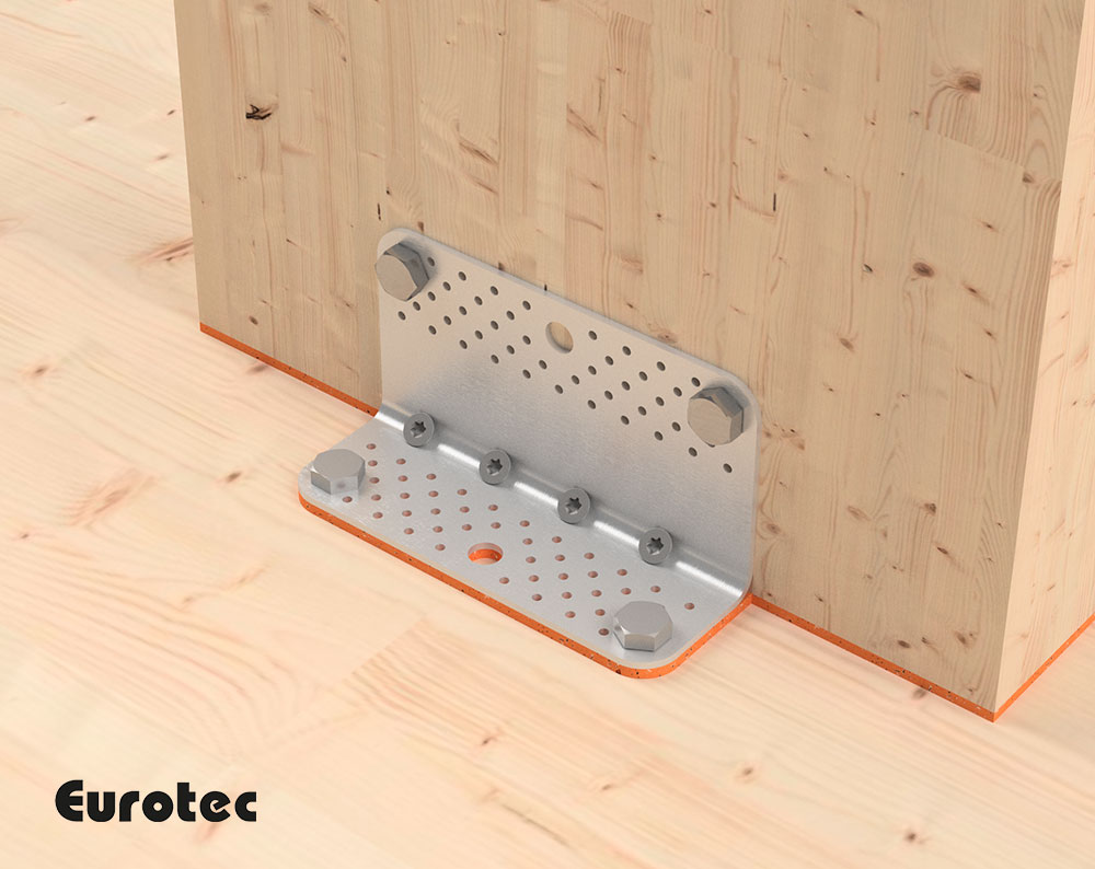 Ergänzen Sie die Eurotec Scherwinkel und Systemwinkel CLT mit der SonoTec Winkelentkopplung. Diese dafür gefertigten Unterlagen werden aus dem SK04 Material hergestellt, welches aus Kork und Naturkautschuk besteht. Die SonoTec Winkelentkopplung wird angewendet, um Schwingungen zu dämpfen.