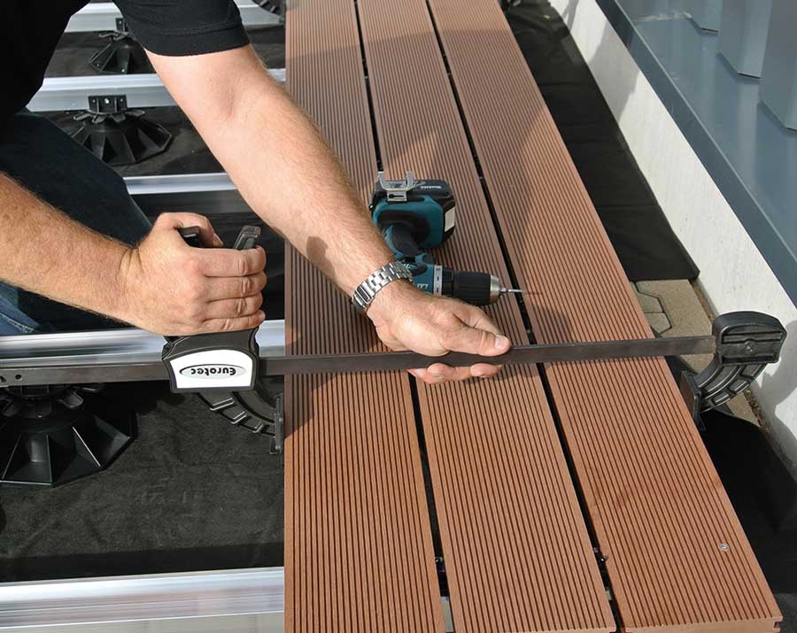 Zusammen mit z. B. den Distanzklötzchen wird so ein gleichmäßiges Fugenbild mit gerade verlaufenden Terrassendielen erreicht.