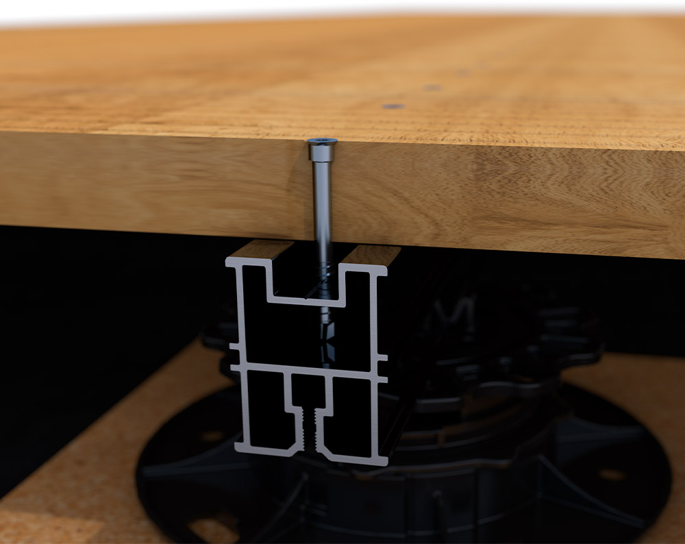 Möchten Sie die Terrassendielen mit Schraube direkt an den Profilen montieren, drehen Sie das Profil mit der Unterseite nach oben. Auf diese Weise bietet die spezielle Geometrie der Profile der Schraube ausreichend Platz zur Bewegung und mindert somit das Bruchrisiko.