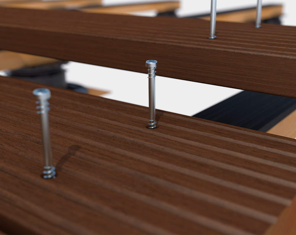 Mithilfe der Terrassotec Zylinderkopf A2 von Eurotec können Terrassendielen problemlos auf einer Unterkonstruktion aus Holz befestigt werden.