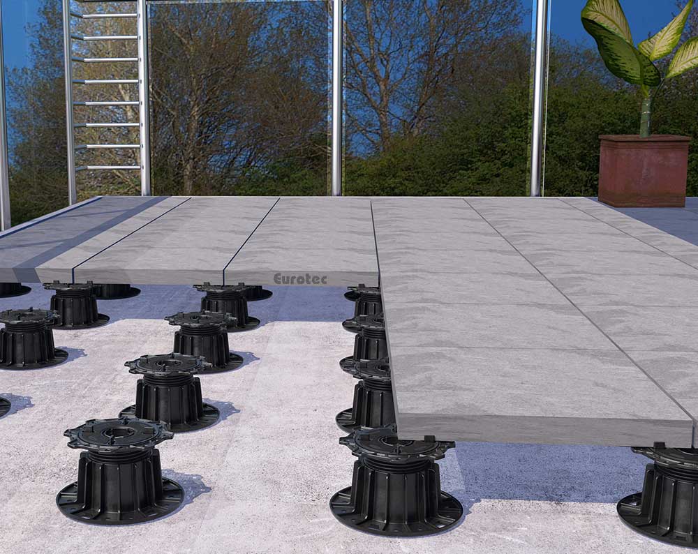 Die Verstellfüße GIANT von Eurotec eignen sich gezielt für die Einzelauflagerung von schweren, großformatigen Steinplatten oder Keramikfliesen. Die Reihe hat vier Varianten zu bieten, welche alle über einen stufenlos justierbaren Bereich von 40 bis 220 mm verfügen. Die Aufbauhöhe lässt sich mit dem Erweiterungsring GIANT um weitere 170 mm erhöhen.