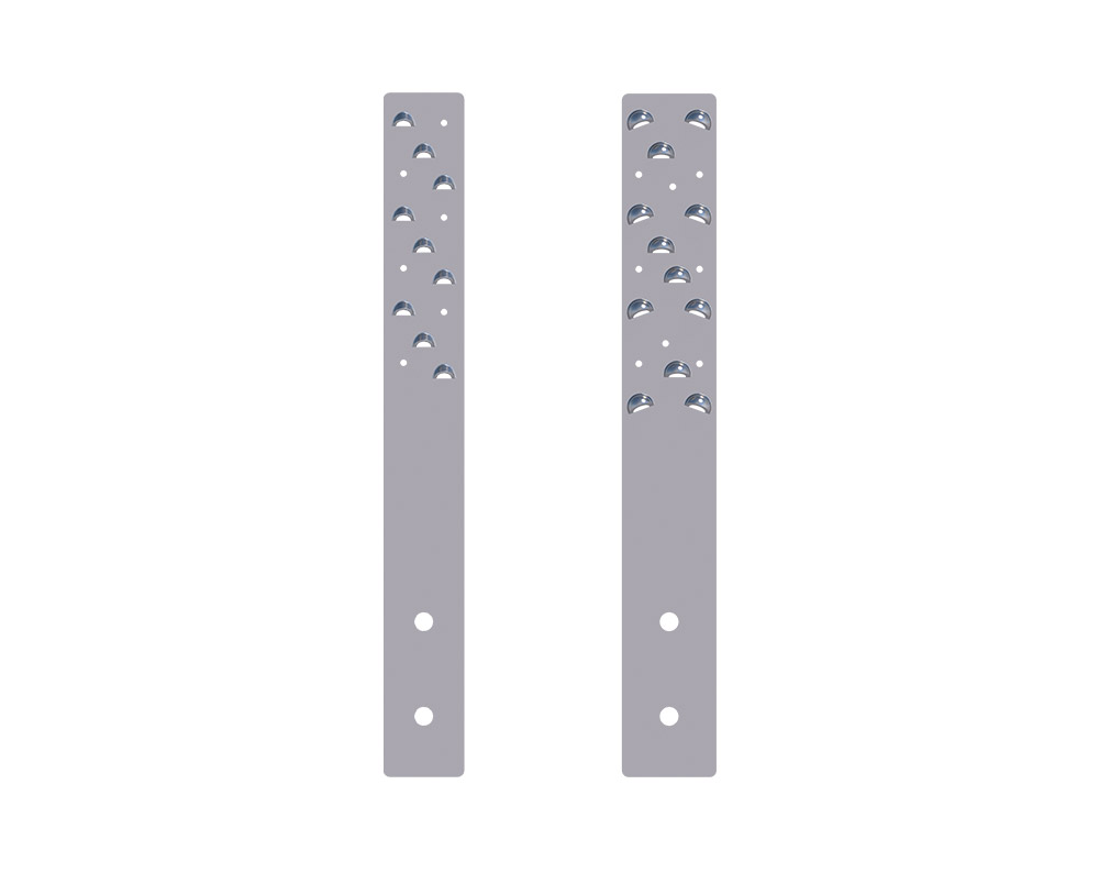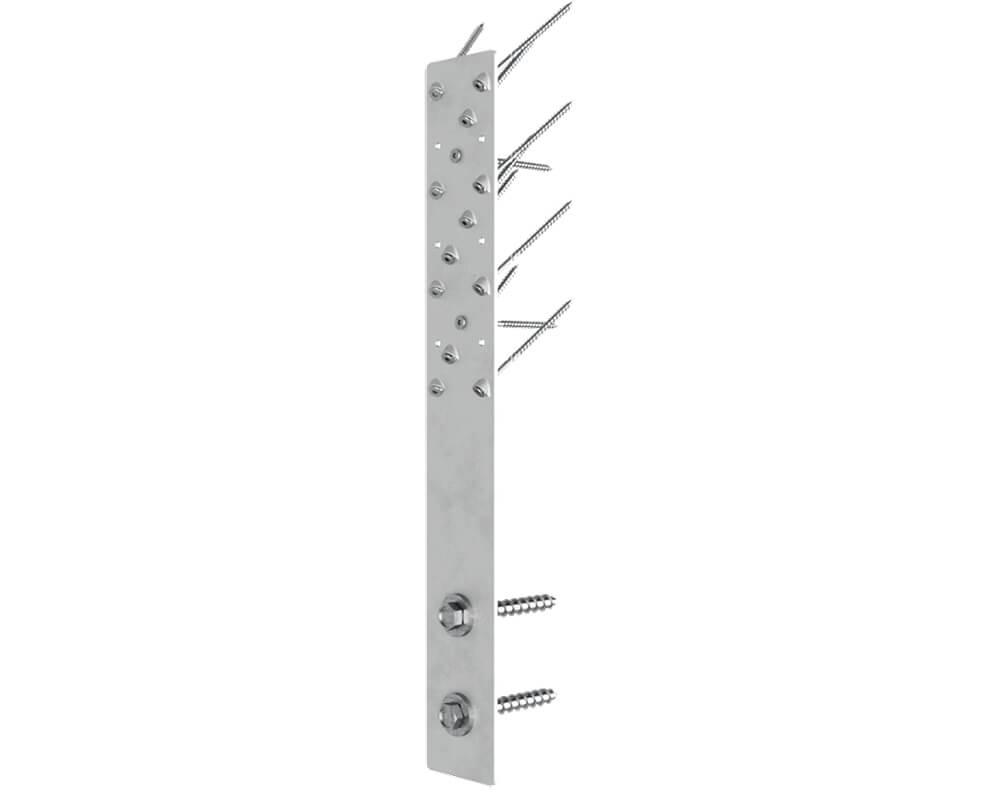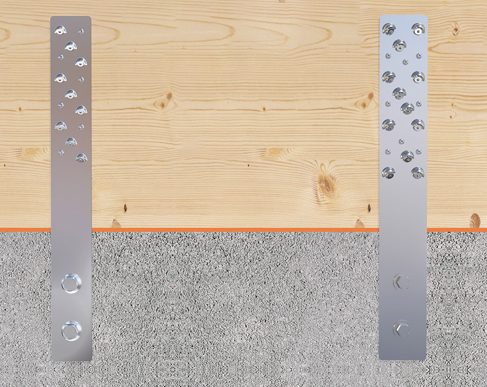 Die Verankerung im Holz erfolgt durch Senkkopfschrauben 5 x 120 mm in einem Winkel von 45°. Dank den speziell hierfür vorgesehenen Löchern welche auch als Schraubenführung dienen entsteht eine kraftschlüssige Verbindung zwischen Schraubenkopf und Zuglasche. Bei der Zuglasche HB70 sind jeweils 2 Löcher Ø 5 mm zur 90° Verschraubung vorgesehen. Die Verankerung im Beton erfolgt durch die hierfür vorgesehenen Löcher (Ø 14 mm) mit unserer Rock-Betonschraube oder Bolzenanker.